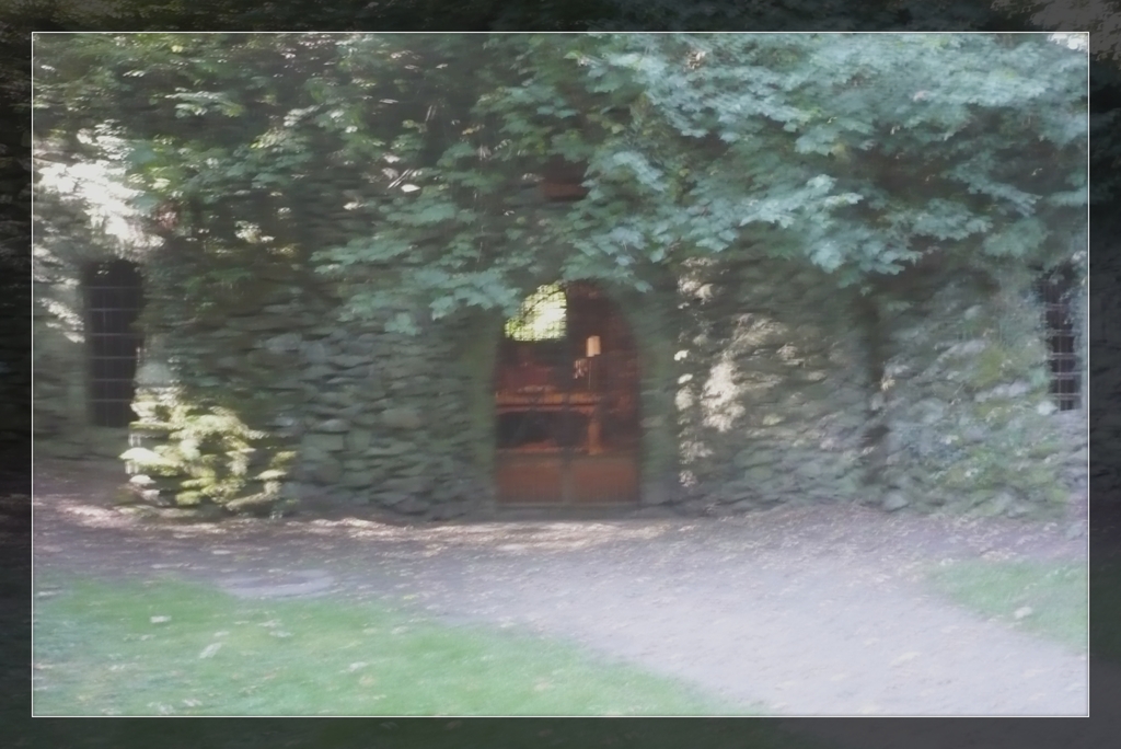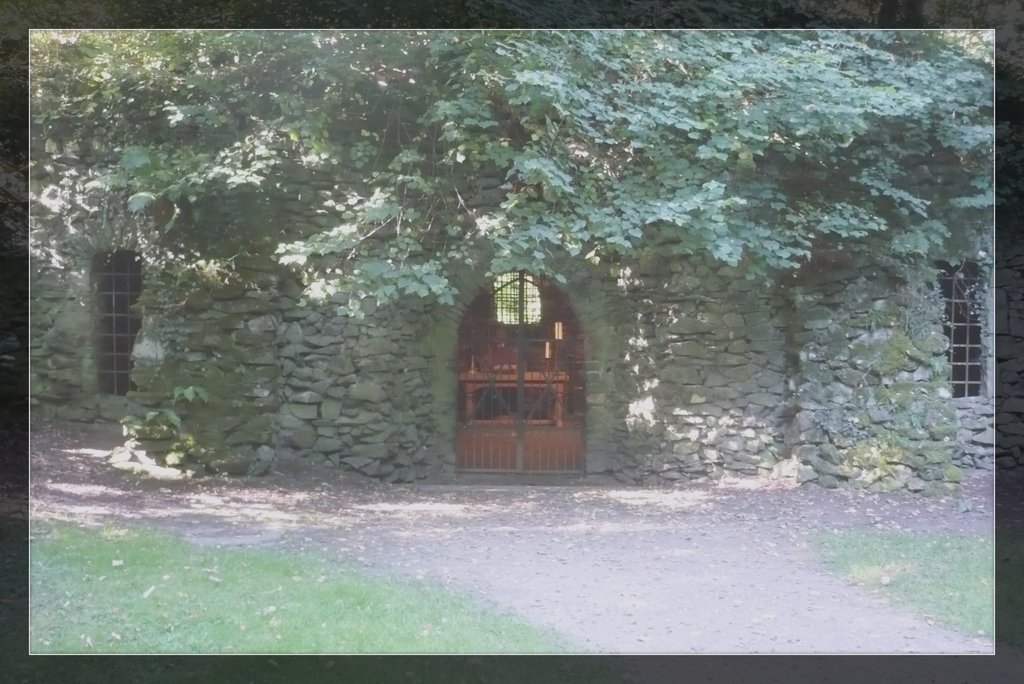 Marquise de Hanau-Münzenberg: Keine Ahnung jetzt wieso, aber seltsamerweise nur teilweise. Also, ich versuch’s Ihnen mal zu erklären. Zuallererst taucht die Einsiedelei in derart ver-schwommenen Konturen auf, sodass mir stets schwindelig wird. Im Inneren zeichnet sich schemenhaft irgendwie ein Tisch mit einer Kerze drauf ab, an dem anscheinend jemand sitzt.
