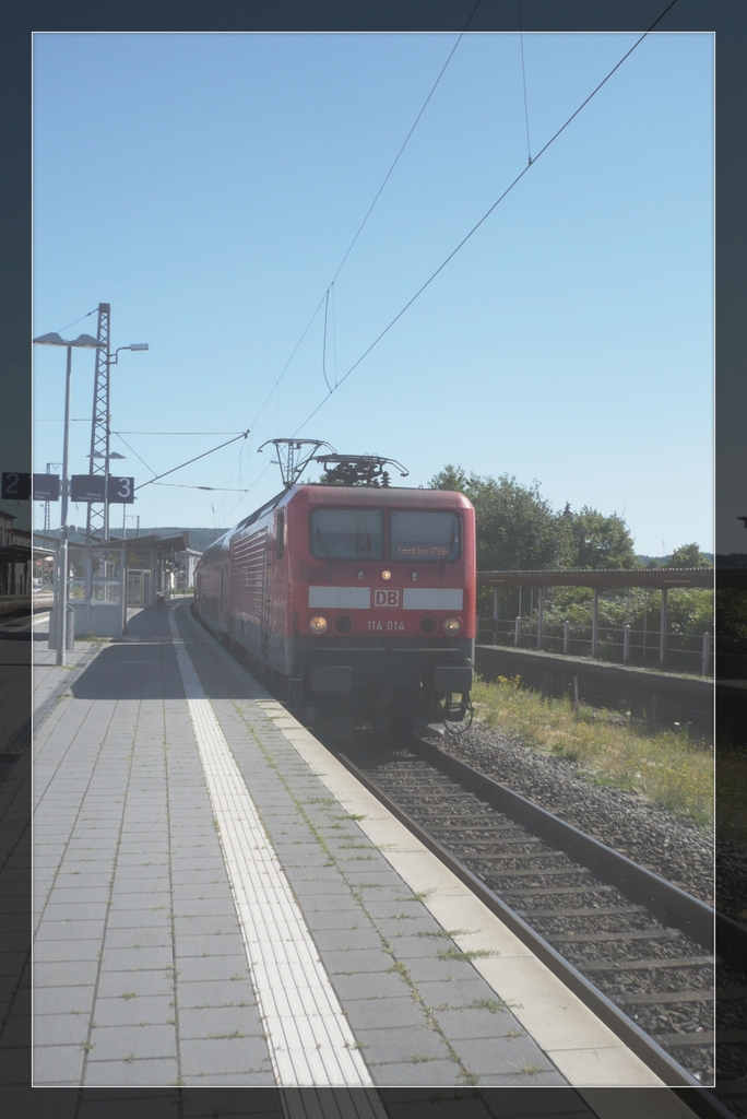 Karussellpferd Hatatitla: Du erhältst unaufgefordert einen einfachen, unbearbeiteten Schnappschuss. Darauf zu erblicken Wächtersbachs Bahnhof, Aufnahmedatum 01. Juli 2018, mit einer abfahrtbereiten Regionalbahn.