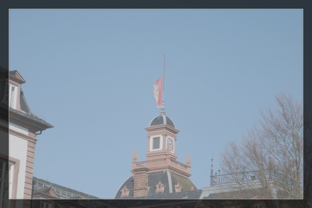 Karussellpferd Theluma: Nämlich, am 25. März 2020, mitten im Lockdown 1, blieb sie während der nach dem Frühstück üblichen Promenade kurz vor Passieren des Haupttrakts auf dem Mainuferweg stehen, ließ sich von einer ihrer Hofdamen das Fernglas zur Tierbeobachtung reichen, beäugte vergrößert die auf gräfliches Geheiß hin gehisste achtwöchige Trauerbeflaggung.