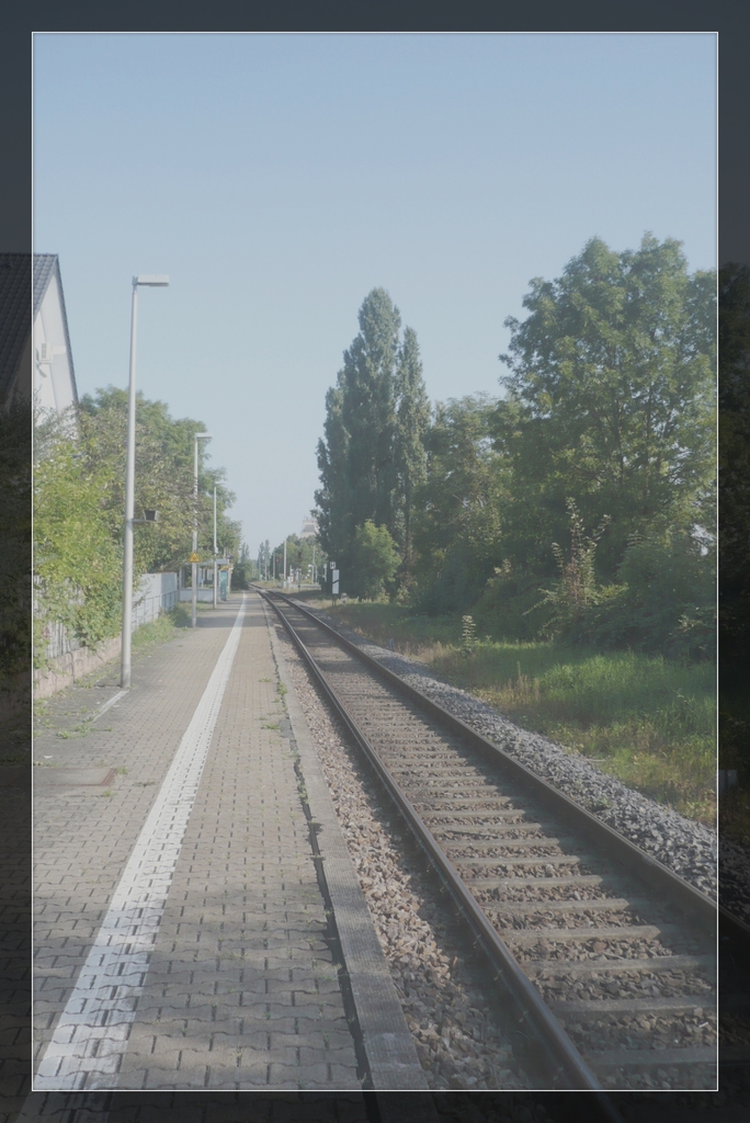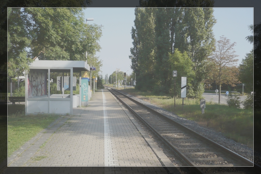 Hofdame Veronique: Treffend formuliert, ma chère. Klein-Auheims Bahnstation total verwaist. Das Wartehäuschen steht sinnlos in der Gegend rum.