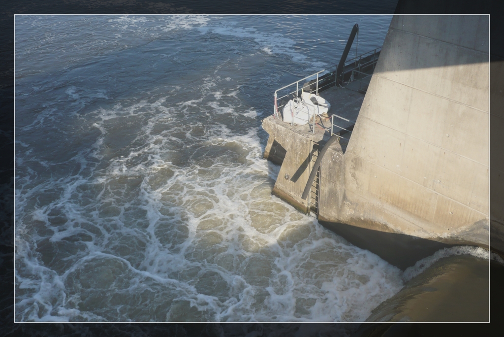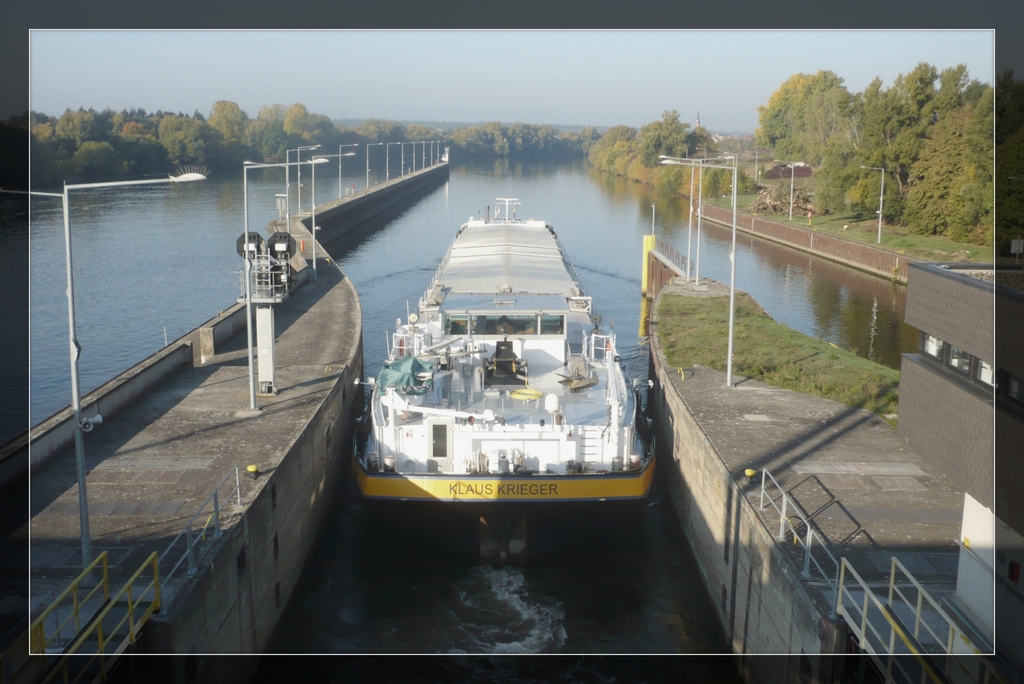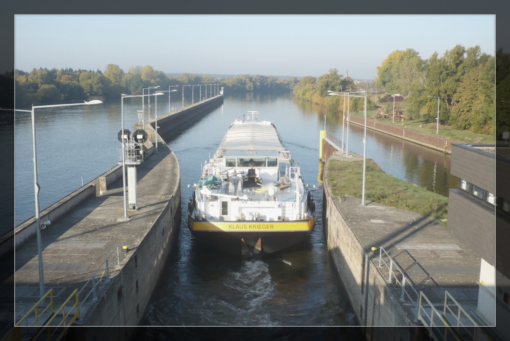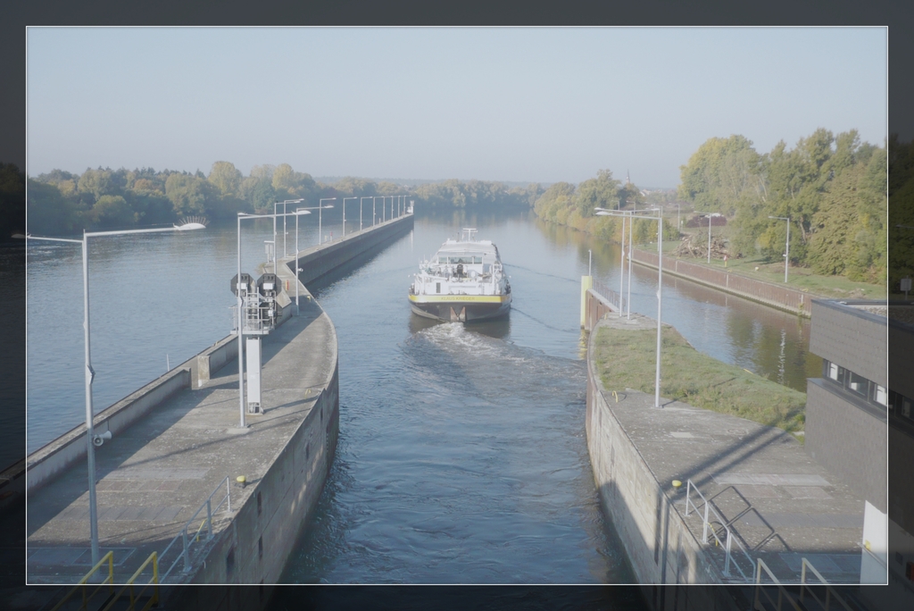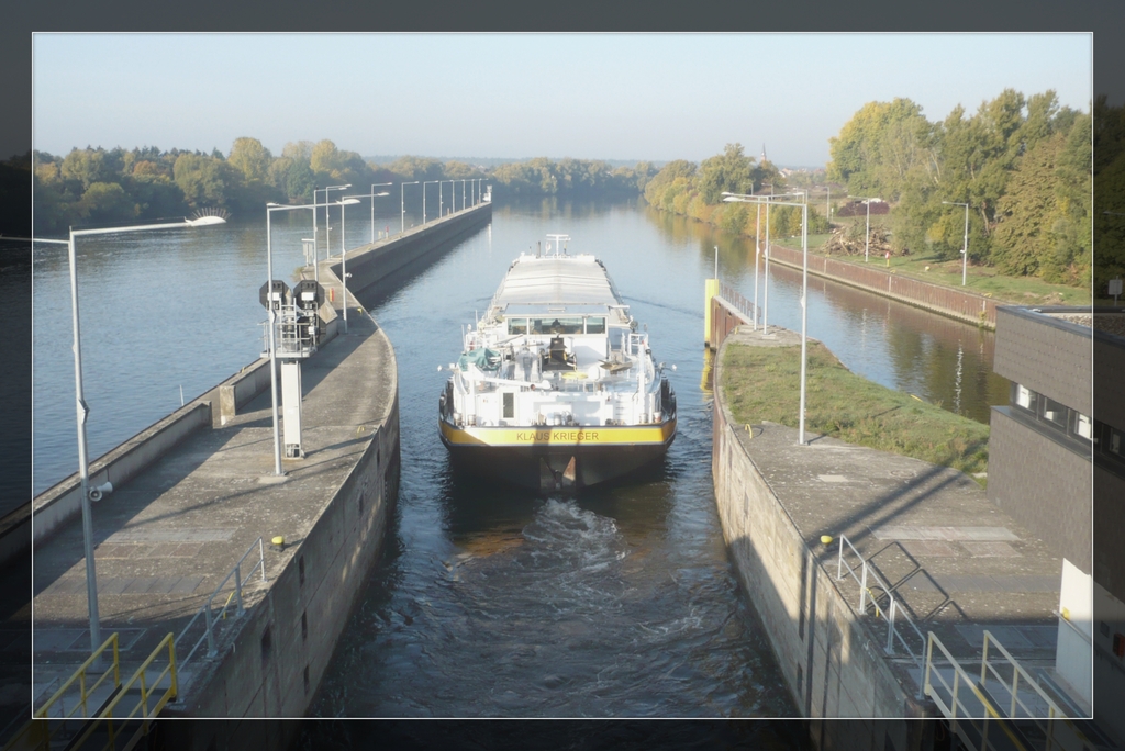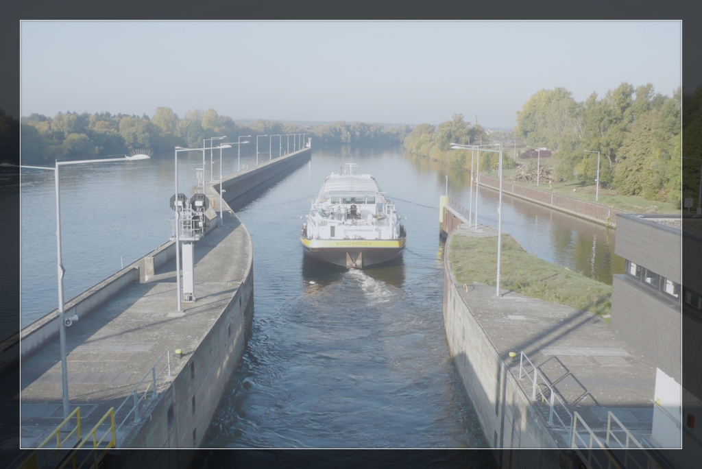 (Handylautsprecher, Personalchefin Schwester Amanda): Von Zeus, Poseidon und Hades rücksichtslos zur den auf Großkrotzenburger Seite liegenden Schleusenkammern geschleppt, benutzten sie dort das zufällig durchgeschleuste Schiff für perfide Absichten. In beängstigender Pose baute sich Jonathan alias Poseidon am Brückengeländer auf, blickte grimmig dem ausfahrenden Binnenfrachter hinterher; unentwegt hielt er seinen rechten Arm in Position, gnadenlos bereit, den göttlichen Dreizack jederzeit ins Mainwasser zu schleudern.