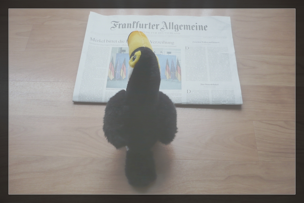 Auf der Titelseite stand irgendwas davon, dass Frau Merkel wegen irgendwas um Verzeihung bittet. Oder so ähnlich. Für mehr waren die Lichtverhältnisse zu miserabel. Zudem versperrte der Seigneur de Beilstein, also mein Tukan, größtenteils die Sicht aufs Papier. Und außerdem hatte ich’s eilig. C’est la verité!