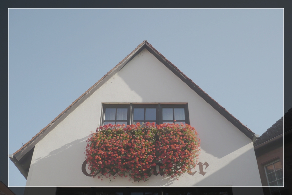 Fürstäbtissin von Ilbenstadt: Geschlossen. Der Eisladen. Anstatt stärkender Wegzehrung in unseren Händen sehen wir roten Blumenschmuck am Haus.