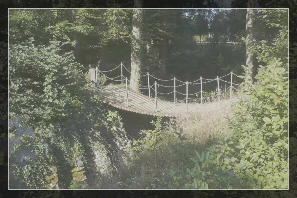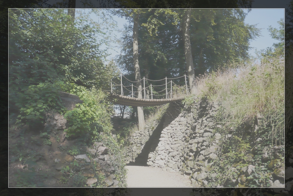 Marquise de Hanau-Münzenberg: Der Schatten spricht: „Madame la Marquise kennen mich. Ich bin der, welcher Sie in der letzten Walpurgisnacht auf des Blocksbergs Gipfel schmerzlich vermisste. Wo waren Gnädigste? Sämtliche Karussellpferdchen kamen auf Ziegenböcken geflogen. Am heißen, hell lodernden Feuer gabs jede Menge original ‚Thüringer Bratwüste‘ vom Grill. Dazu literweise zehnprozentiges ‚Oma Teufel’s Schwarzbier‘.“ Mit AAAAAAAAAA-AAAAAAAAAAHHHHHHHHHH!!!!! stürze ich aus dieser verfluchten Schlucht, stolpere kreischend auf die Teufelsbrücke zu. Dahinter das rettende offene Gelände. Zu früh gefreut. Mitten auf dem wackligen Übergang bringen mich zwei der Holzbalken jäh zu Fall. Verflixt und zugenäht. Alles tut weh. Vom Hexenhaus ertönt schadenfrohes Hohngelächter: „Hahahahaha, ätsch bätsch!“ Nichts wie weg! Mein Hinfallen, ihr Werk! Jeden Augenblick werden sie Windböen herbeizaubern, welche mich erfassen und hinab in die Schlucht stoßen – direkt in Darth Vaders wartende Arme! Auf der anderen Seite angelangt ein prüfender Blick auf die Brücke.