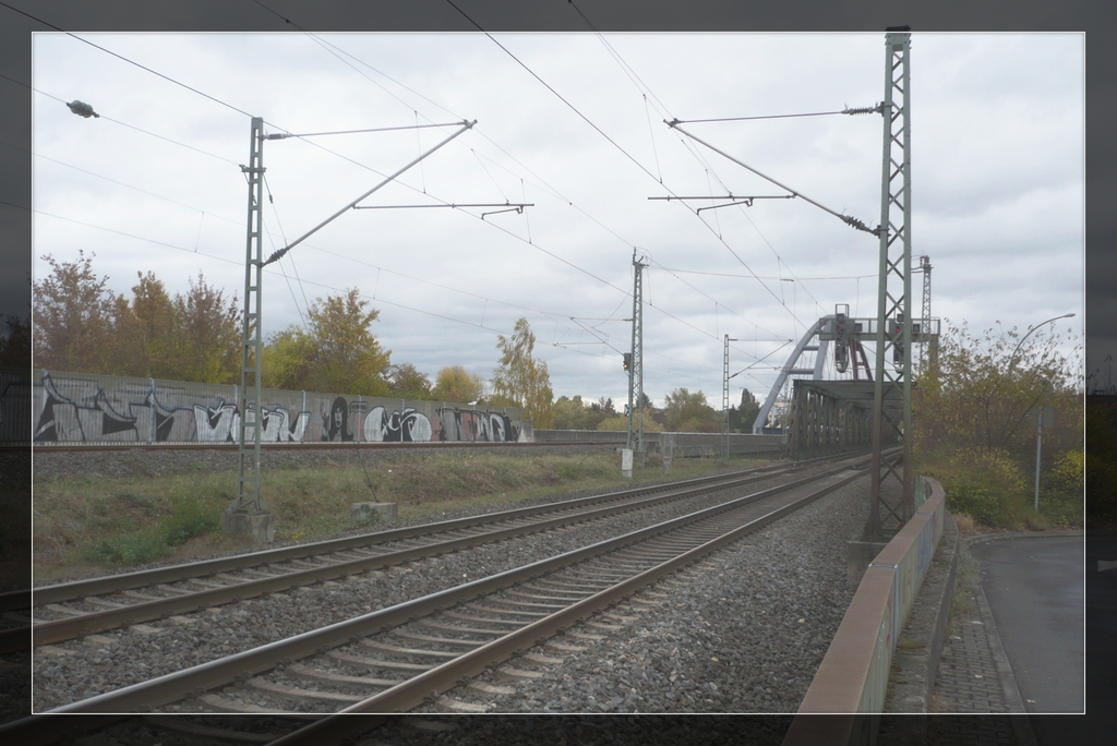 Spaziergänger 2: Mit der S8 erreiche ich also Steinheim, steige aus, um via Grenzübergang Steinheimer Brücke zum Hafen zu gelangen. Auf dem Bürgersteig überkommt mich beim Uhrenblick ein lustiger Einfall: „Hm, genug Zeit vorhanden. Komm, Olaf, rasch zurück auf die andere Seite, DEN ulkigen Spaß gönnst du dir. Drüben steht doch die Grenzmauer. Dahin läufst du jetzt, hältst vorwitzig dein Händchen rüber.“